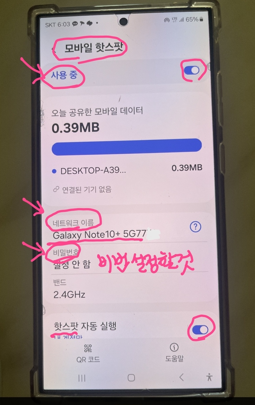 모바일 핫스팟을 누르면 '사용중'으로 나타나고 , 핫스팟 자동설정으로 하고,